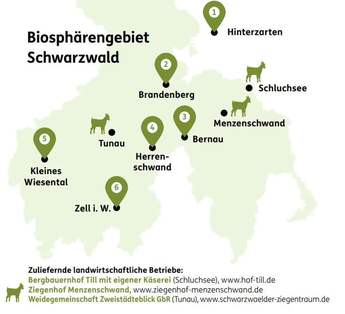 La chèvre joue un rôle décisif dans la zone de biosphère de la Forêt-Noire, en particulier sur les pentes raides typiques de la région. Grâce à son comportement alimentaire, elle régule la repousse des jeunes arbustes et contribue ainsi à la protection de la nature et des biotopes. En mangeant, elle contribue au maintien de l'ouverture des pâturages de grande valeur écologique de la Forêt Noire.