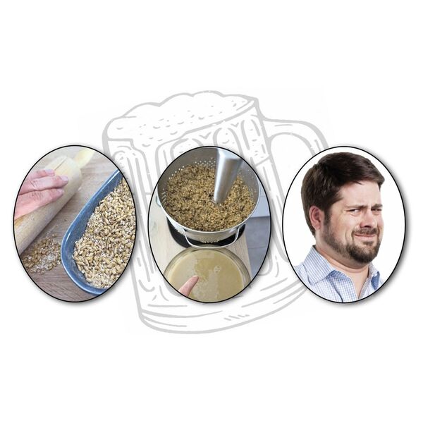 Avant toute chose, il faut absolument stériliser tout le matériel que l'on va utiliser, ce qui n'est pas une mince affaire... La moindre infection et votre brassin est foutu. Première étape : concasser le malt. Pas facile sans le matériel adéquat - désolé, on n'a pas de moulin à malt à la maison. Place à l'empâtage, pour extraire l'amidon du malt concassé. Cela donne la maische.
