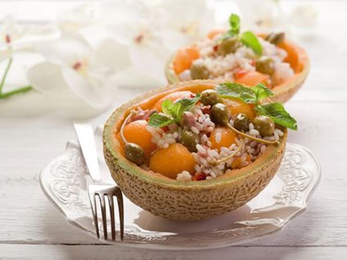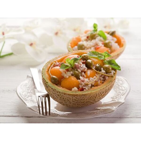 ❹ Mélangez délicatement puis servez à vos invités cette salade en portion individuelle dans sa demi-enveloppe de melon.