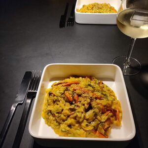 Votre four est chaud ! Huilez bien la plaque de cuisson et disposez-y les lamelles de potimarron. Assaisonnez et ajoutez le curcuma et le safran sur les lamelles. Enfournez pour 20 minutes. Ajoutez les potimarron rôtis à la fin de la cuisson de votre risotto, vous verrez le plat changer radicalement de couleur !