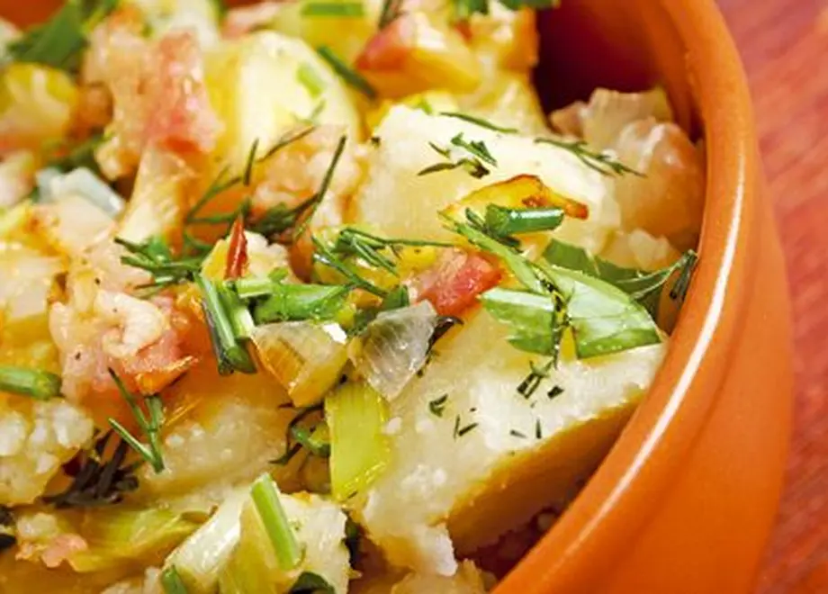 4) Dans un plat en terre cuite avec un couvercle, disposer une couche de lard, puis une couche de pommes de terre, saler, puis une couche d'oignons. Recommencer jusqu'à épuisement des ingrédients tout en terminant par une couche de pommes de terre.