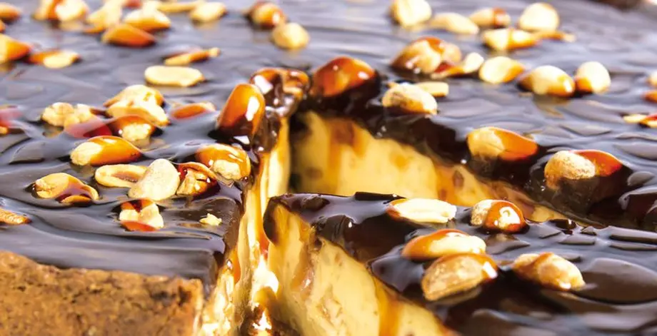 3) Verser la préparation de ganache sur le beurre de cacahuètes et parsemer de quelques cacahuètes grillées. Mettre au four à 180°C durant 20 minutes.