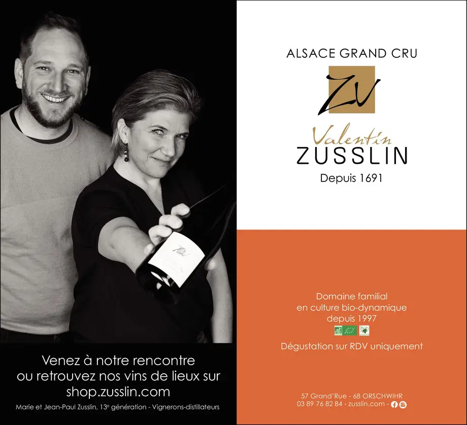 Le domaine Valentin Zusslin à Orschwihr, 16 hectares à peine pour environ 100 000 bouteilles par millésime, fait partie des grandes maisons alsaciennes, non pas par l'étendue de sa production, mais par la finesse de ce qui se trouve au fond de leurs bouteilles "haute couture". Un avis confirmé par les professionnels du métier, cavistes et autres fines gueules que nous connaissons. Crémant Liebenberg élu Meilleur Crémant de France en 2015 par la RVF ; Pinot Noir Bollenberg d'exception tutoyant les sommets, typiques de la Bourgogne, vinifié avec une grande précision, et l'une des "spécialités" de son vigneron Jean-Paul Zusslin. Son Riesling Grand Cru Pfingstberg n'est pas en reste non plus, avec sa belle tension et ses notes d'agrumes pimpantes.