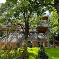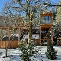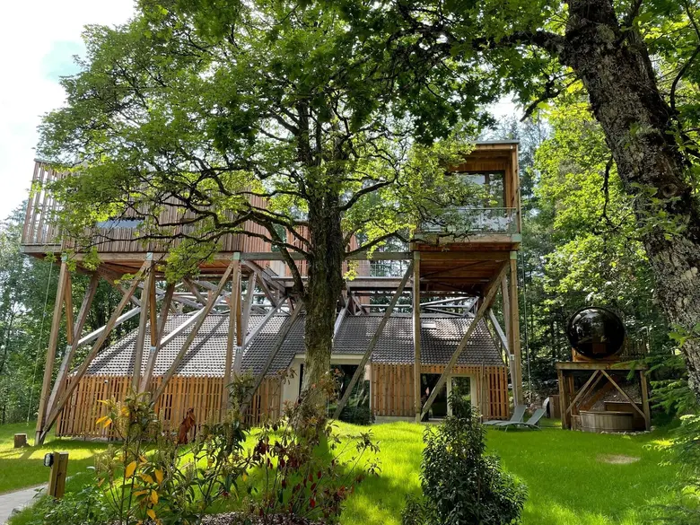 Entouré d'arbres majestueux, ce grand refuge de Luxe à l'architecture surprenante ne laisse pas indifférent. 3 cabanes de luxe perchées surplombent à plus de 9 m un espace privé entièrement dédié aux groupes équipé d'un grand salon, une cuisine équipée (où peut intervenir un chef et sa carte gastronomique). Billard, espace détente avec Spa (Hamman, bain finlandais et sauna panoramique) saura ravir tout le monde.