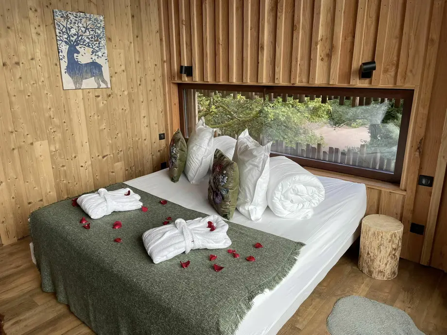 Dans une clairière, isolée des autres cabanes, la Villa Forêt & Spa a vocation à accueillir les familles nombreuses (de 8 à 18 personnes), les groupes d'amis, mais aussi les séminaires d'entreprise ou de yoga.