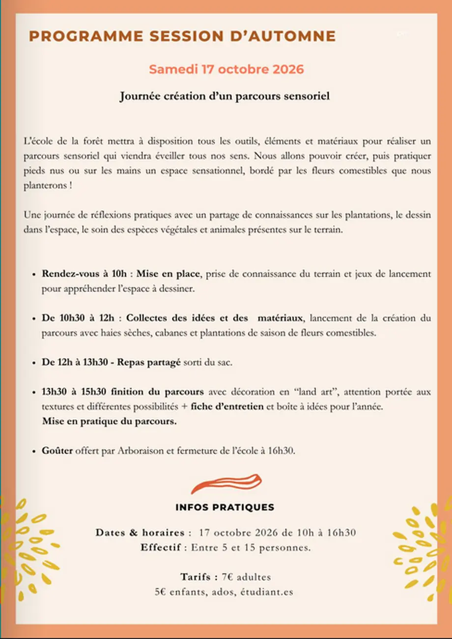 Le samedi 17 octobre 2026, Arboraison vous propose une journée immersive dédiée à la création d’un parcours sensoriel en pleine nature. Au cœur de la forêt, les participants sont invités à imaginer, concevoir et aménager un espace qui stimule les sens, en utilisant des matériaux naturels et des éléments du terrain.