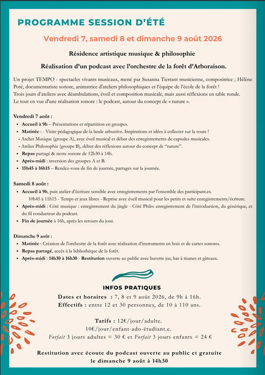 Du 7 au 9 août 2026, Arboraison accueille, au cœur de sa forêt comestible, une résidence artistique mêlant musique et philosophie. Pendant trois jours, les participants sont invités à prendre part à une création collective autour de la réalisation d’un podcast, en explorant le lien entre nature, sons et réflexion.