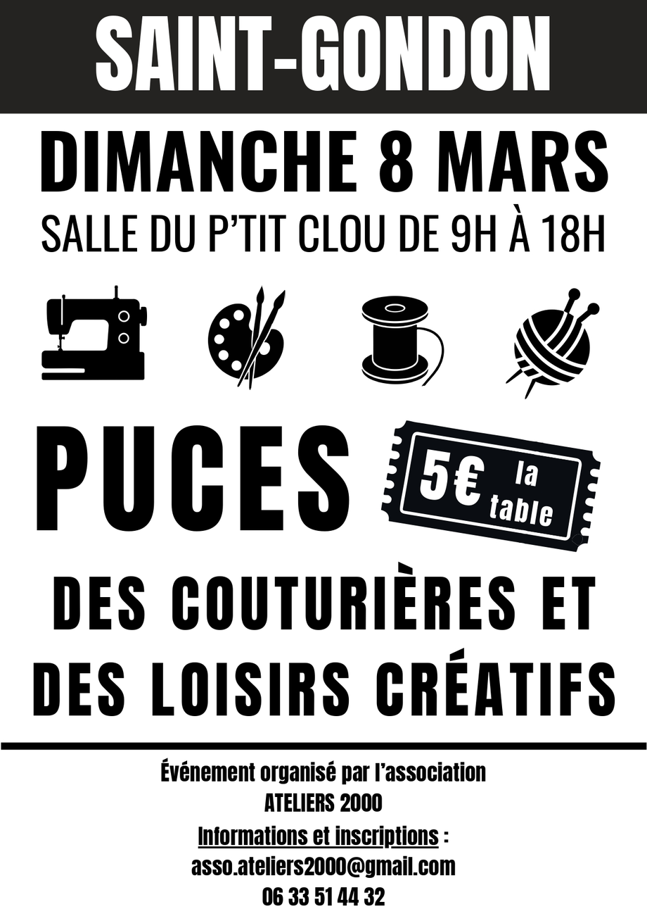 Rendez-vous le dimanche 8 mars, de 9 h à 18 h, à la salle du P’tit Clou à Saint-Gondon pour les puces des couturières et des loisirs créatifs, organisées par l’association ATELIERS 2000.