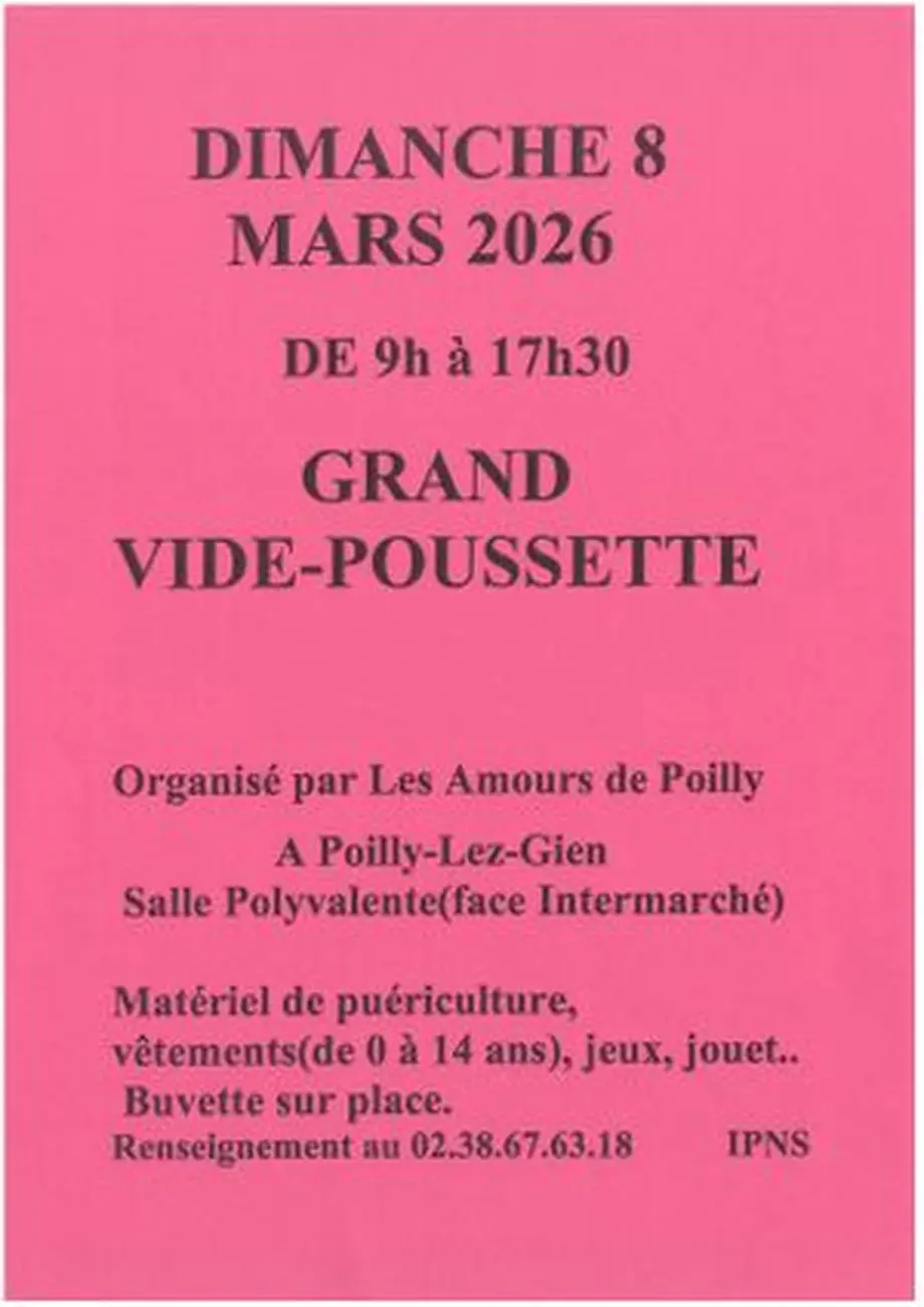 Rendez-vous le dimanche 8 mars, de 9 h à 17 h 30, à la salle polyvalente de Poilly-lez-Gien, située face à Intermarché, pour le grand vide-poussette organisé par l’association Les Amours de Poilly.