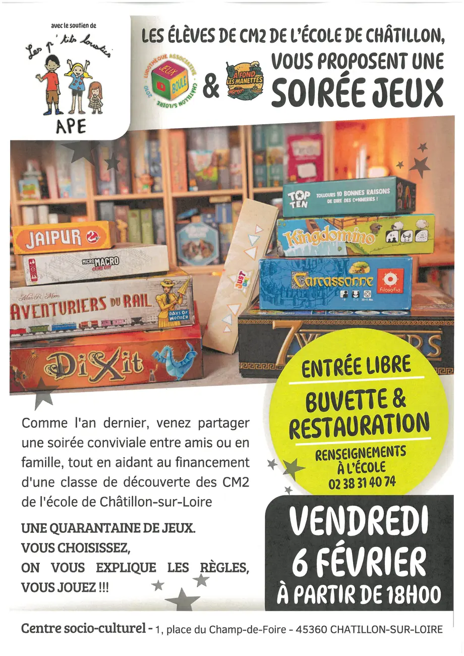 Rejoignez-nous pour une soirée jeux conviviale et solidaire le vendredi 6 février à partir de 18 h au Centre socio-culturel de Châtillon-sur-Loire !