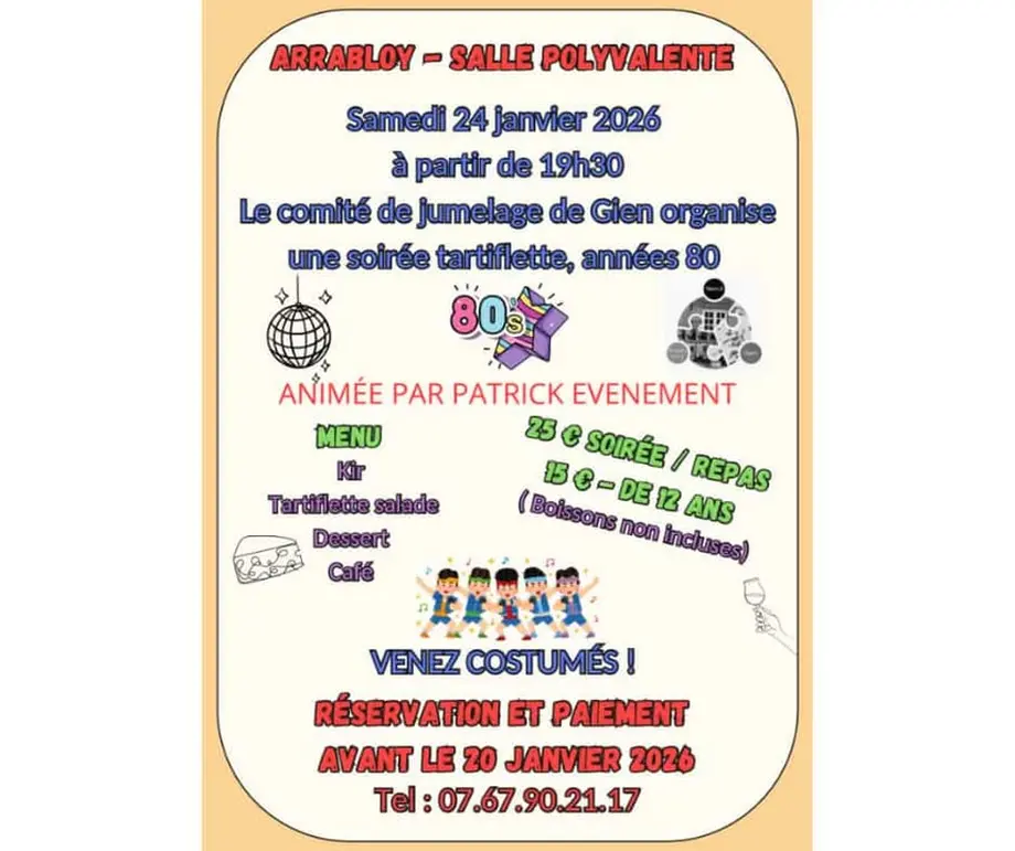 Le comité de jumelage de Gien vous propose une soirée conviviale et festive autour d’une tartiflette, sur le thème des années 1980, le samedi 24 janvier à partir de 19 h 30 à la salle polyvalente d’Arrabloy.