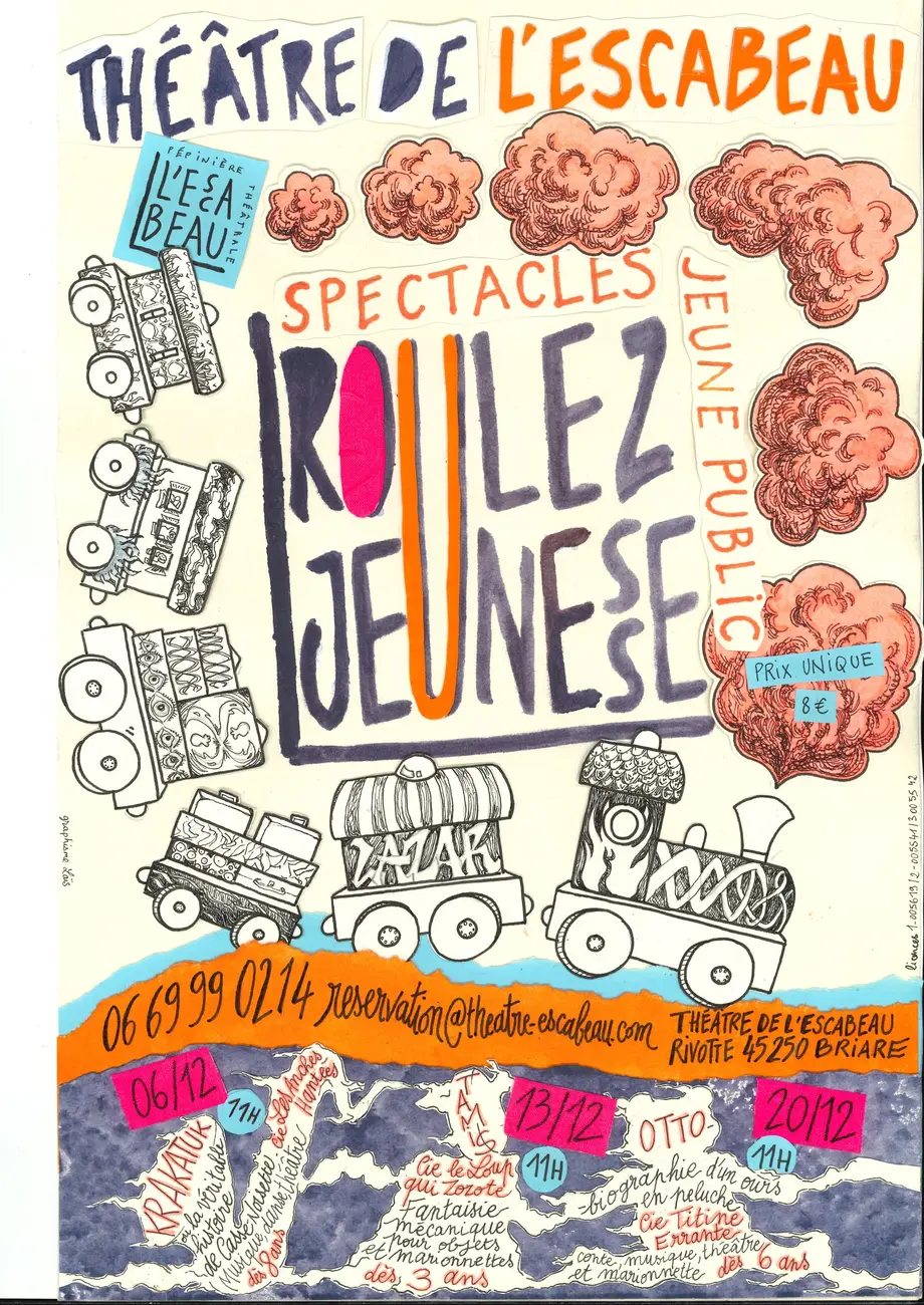 Roulez jeunesse revient avec une nouvelle série de spectacles pour tous; dès 3 ans ! Les jeudis et vendredis sont dédiés aux écoles, et les samedis ouverts à tous les publics. L'occasion pour les plus jeunes de découvrir la Pépinière Théâtrale et de partager des moments d'émotion, de découverte et de plaisir avec les artistes. Un rendez-vous cher à l'équipe du Théâtre de l'Escabeau, heureux d'accueillir les regards curieux et émerveillés des enfants, de la maternelle au collège.