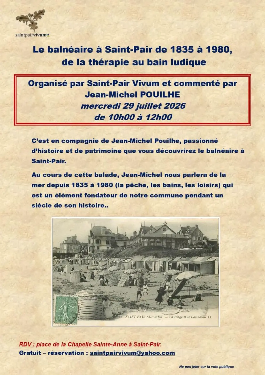 Visite guidée du bourg de Saint-PairLe 22/07/2026Saint-Pair-sur-MerVisite historique du bourg de Saint-Pair, commentée par Jean-Michel Pouilhe.