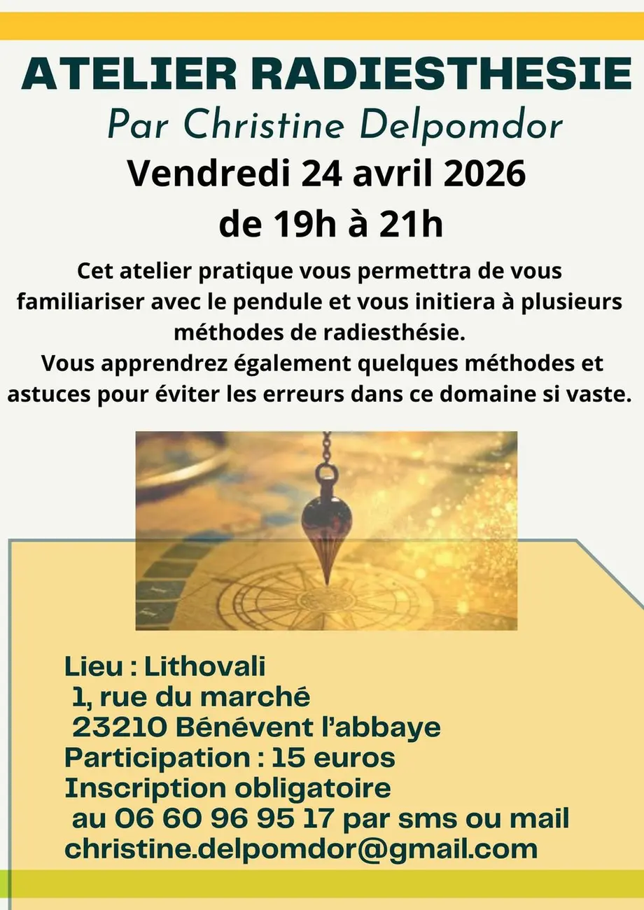 Cet atelier pratique vous permettra de vous familiariser avec le pendule et vous initiera à plusieurs méthodes de radiesthésie.