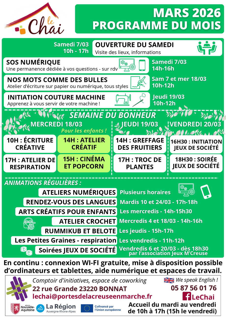 [AGENDA] Voici le programme des animations au Chai pour le mois de mars