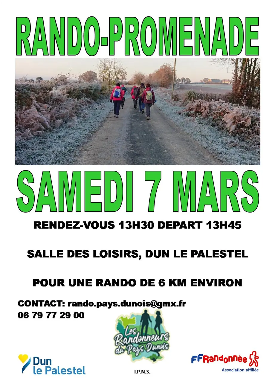 Rando-promenade à Dun-le-Palestel : rendez-vous à la salle des loisirs à 13 h 30 pour une marche de 6 km.