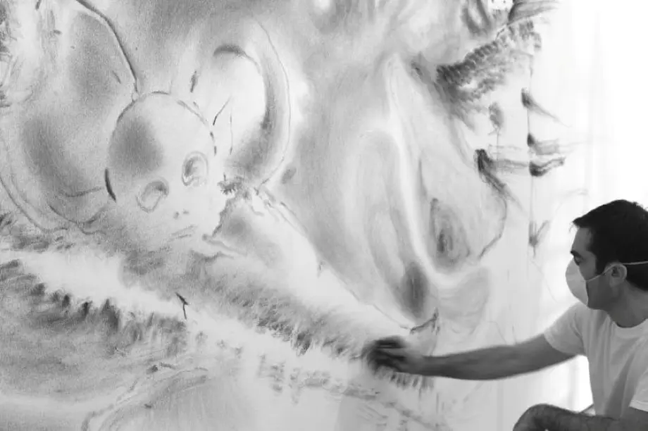 Depuis 1999, ses dessins investissent les murs, qu'il recouvre de poudre de graphite, dessinant par frottage à l'aide de chiffon, obtenant de subtiles valeurs de gris sensuels et soyeux.