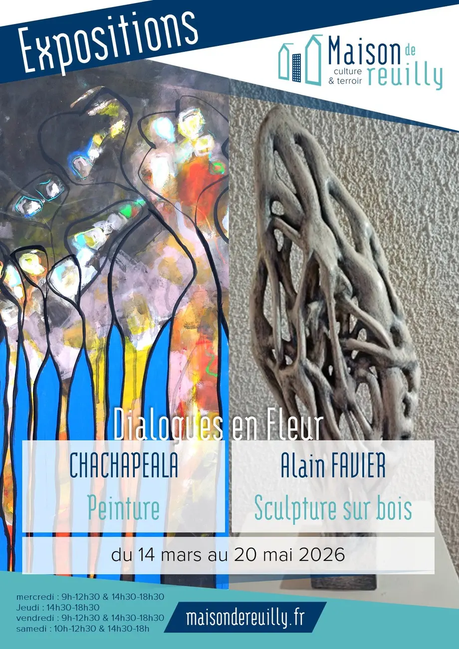 La Ville de Reuilly est heureuse de vous présenter sa nouvelle double exposition culturelle mettant à l'honneur l'artiste et collègue Isabelle Ramain-Péala, ainsi que les sculptures sur bois d'Alain Favier. Une occasion unique de découvrir des œuvres tout en émotion et en maîtrise.