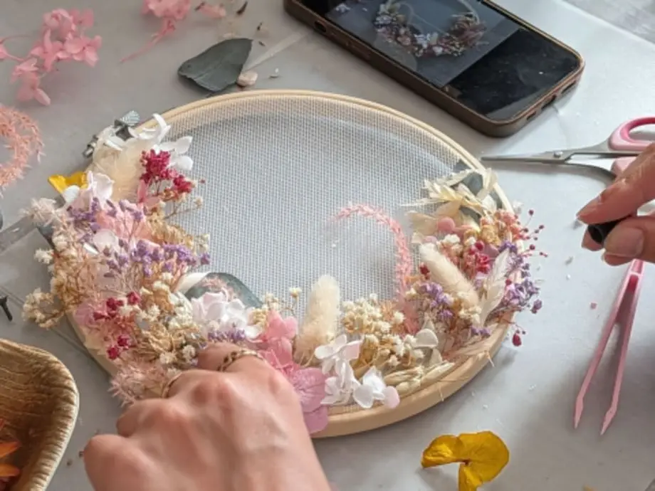 Offrez-vous un moment de douceur et de créativité en réalisant un tambour fleuri délicat et poétique. Lors de cet atelier, vous créerez un tambour fleuri de 20 cm de diamètre, en composant une décoration végétale unique sur tulle, lin ou dentelle. Vous choisirez votre tissu, sélectionnerez les fleurs séchées, puis apprendrez à les assembler harmonieusement pour créer une pièce décorative raffinée.