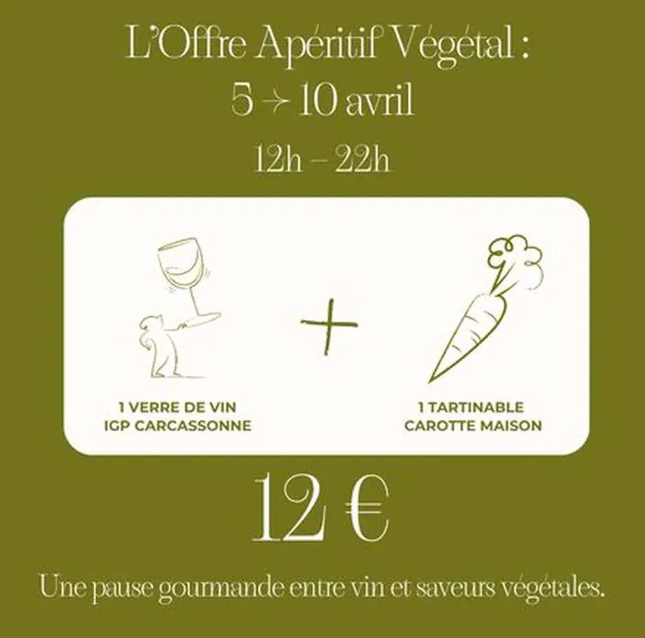 Tout au long de la semaine, le bar du GAÉE prolonge l'expérience avec une offre "Apéritif Végétal" à 12 €. Disponible de 12h à 22h, cette formule comprend un verre de vin de la cuvée Mercure et un tartinable maison à la carotte, 100 % végétal.