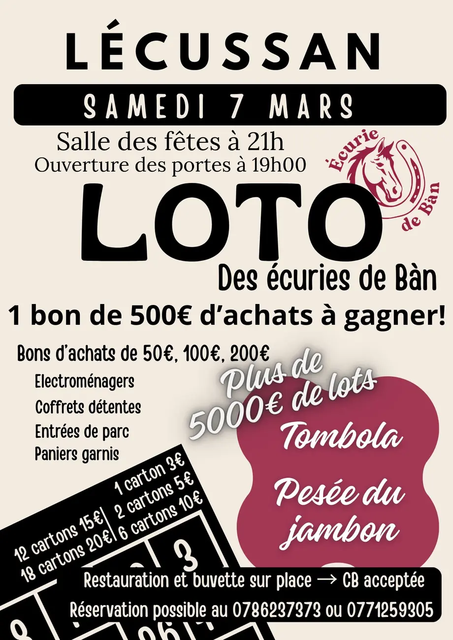LotoLe 14/03/2026Saint-Laurent-de-NesteRendez-vous le samedi 14 mars à la salle du Boila pour un grand loto !