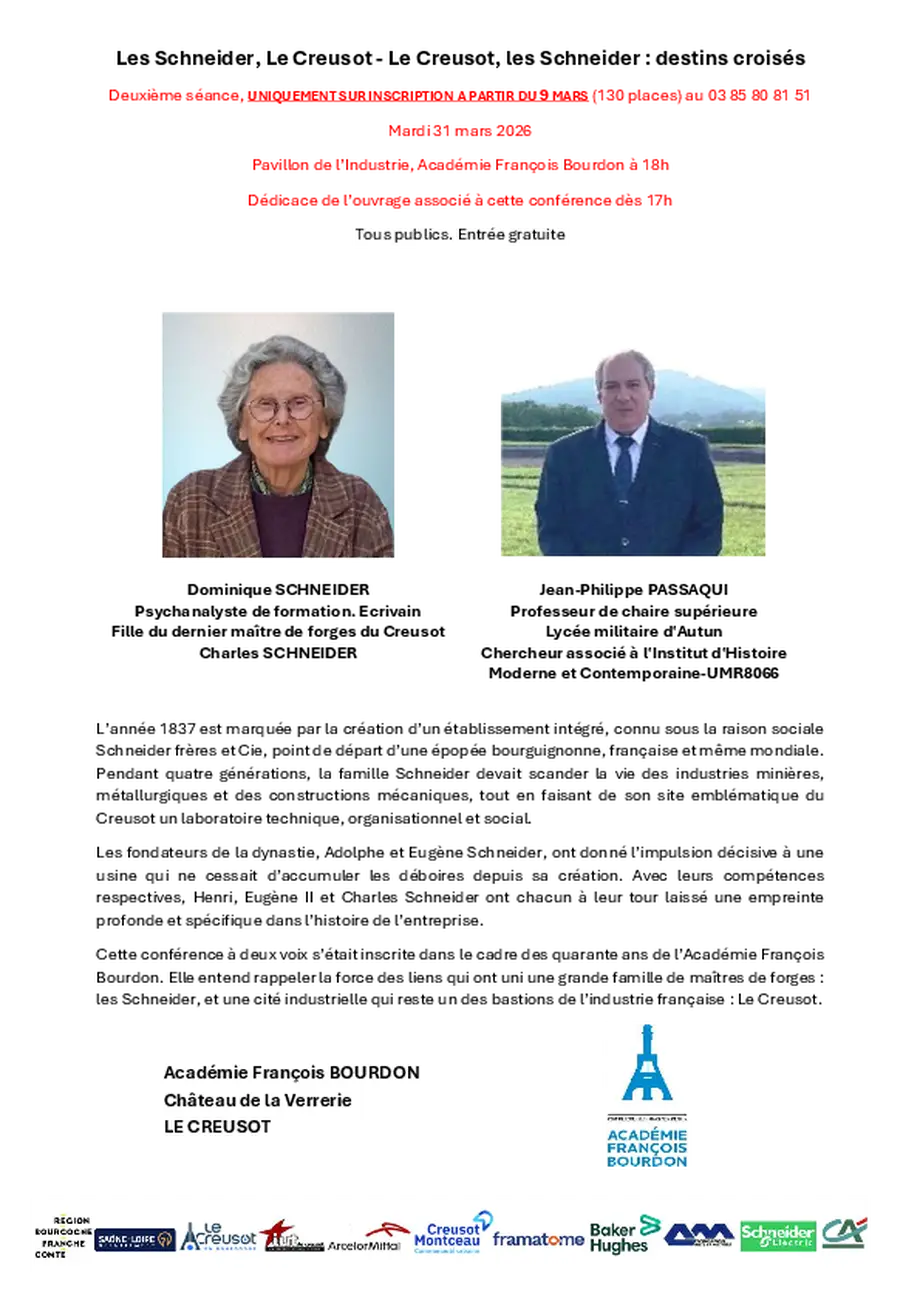 Cette conférence à deux voix s’inscrit dans le cadre des quarante ans de l’Académie François Bourdon. Elle entend rappeler la force des liens qui ont uni une grande famille de maîtres de forges — les Schneider — et une cité industrielle qui reste l’un des bastions de l’industrie française : Le Creusot.