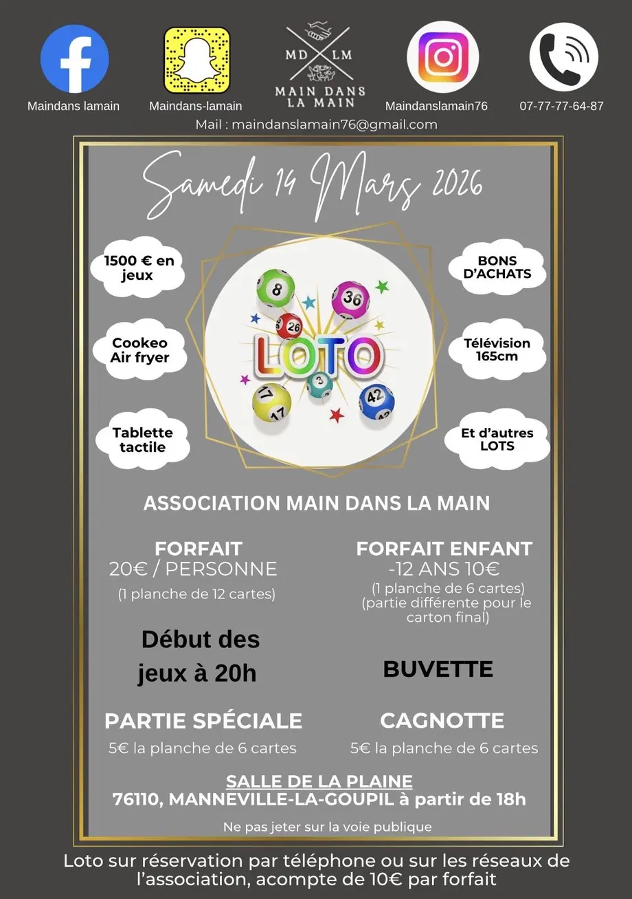 L’association Main dans la Main organise un Loto le samedi 14 mars 2026 à Manneville-la-Goupil et il reste encore des places !