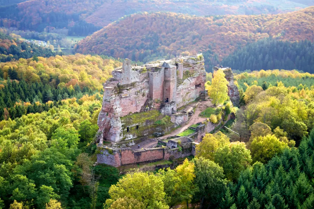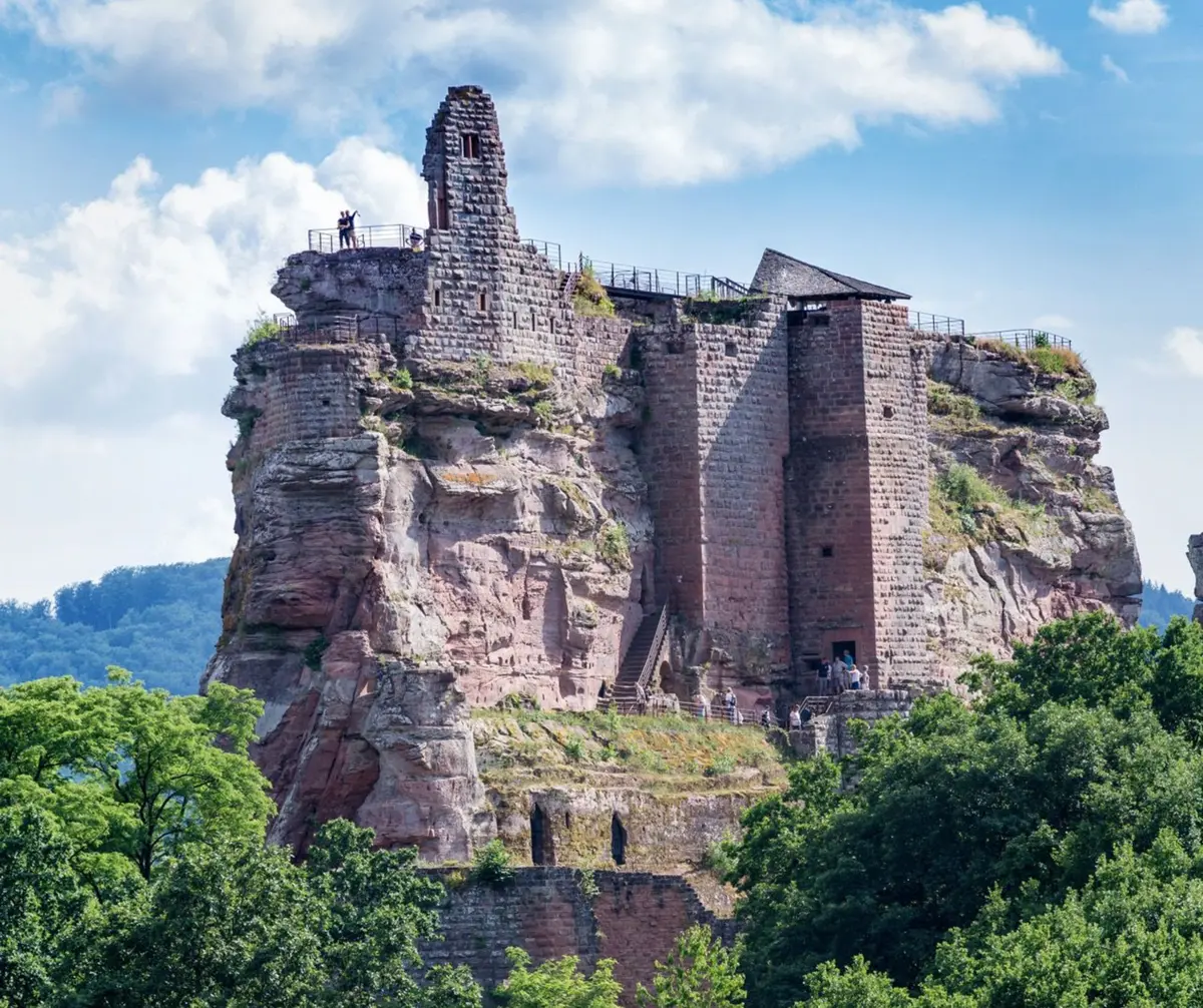 Le château, imbriqué dans un rocher spectaculaire, affiche des dimensions hors normes qui ne s’imposent qu’une fois au pied des murs d’enceinte. Guidé par des reconstitutions du monument qui superposent le passé au présent, le visiteur découvre une architecture militaire et une gestion de l’eau exemplaires, et s’imprègne de l’histoire de la saga familiale dans la galerie des ancêtres. Puis, il libère son imaginaire en progressant dans l’extraordinaire dédale de salles et d’escaliers au cœur même du grès et atteint le sommet, non sans avoir admiré les prouesses des bâtisseurs d’antan. S’offre alors à lui les sublimes paysages des parcs des Vosges du Nord et du Palatinat.