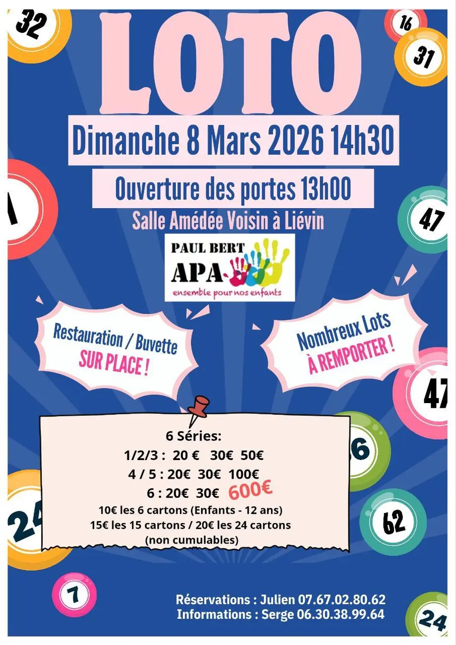 l'association de parents d'élèves de l'école paul Bert de Liévin organise son loto annuel dans le but de financer du matériel et des actions pour le bien être des enfants.