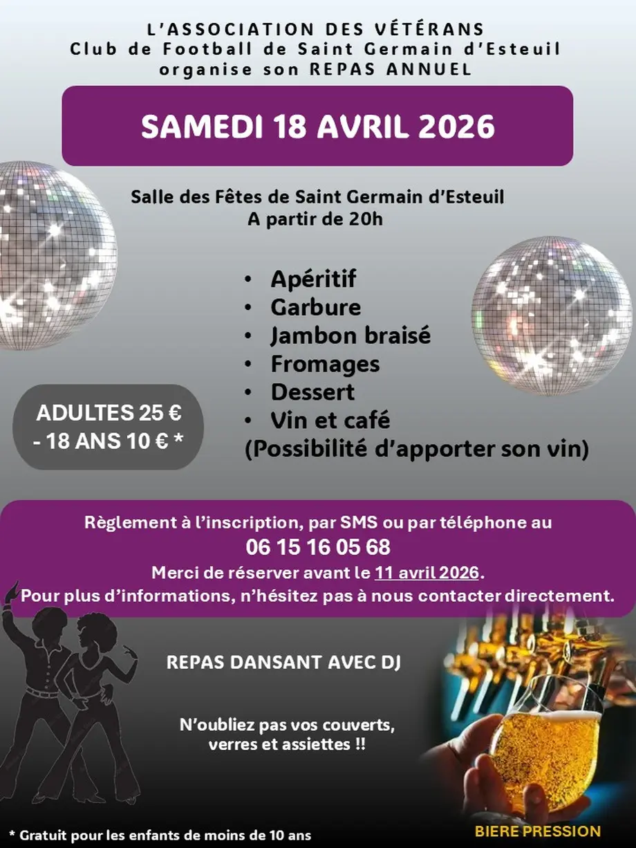 Repas dansant annuel organisé avec DJ par l’association des vétérans du club de football de Saint-Germain-d’Esteuil.