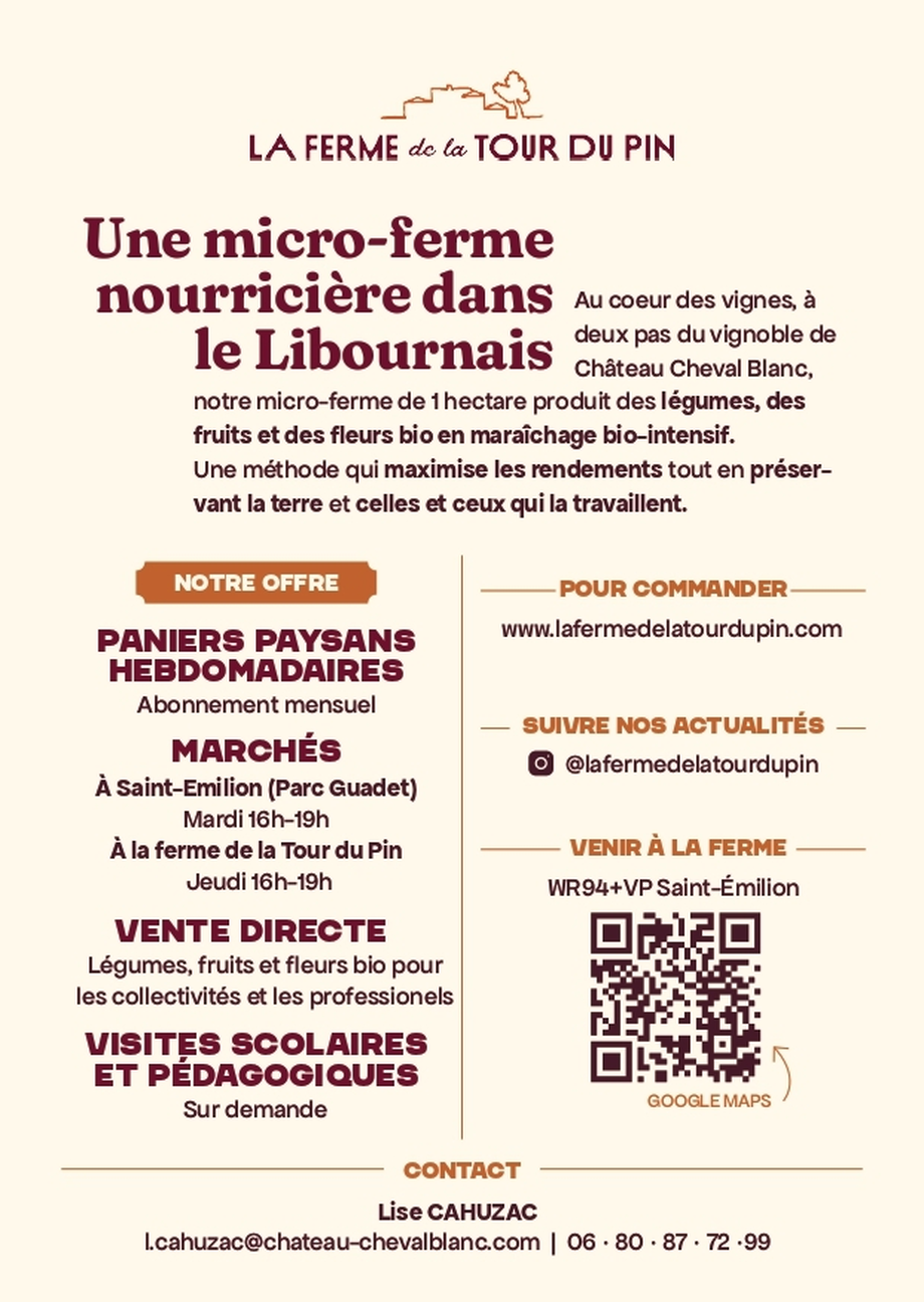 Au cœur des vignes, à deux pas du vignoble de Château Cheval Blanc, notre micro-ferme de 1 hectare produit des légumes, des fruits et des fleurs bio en maraîchage bio-intensif.