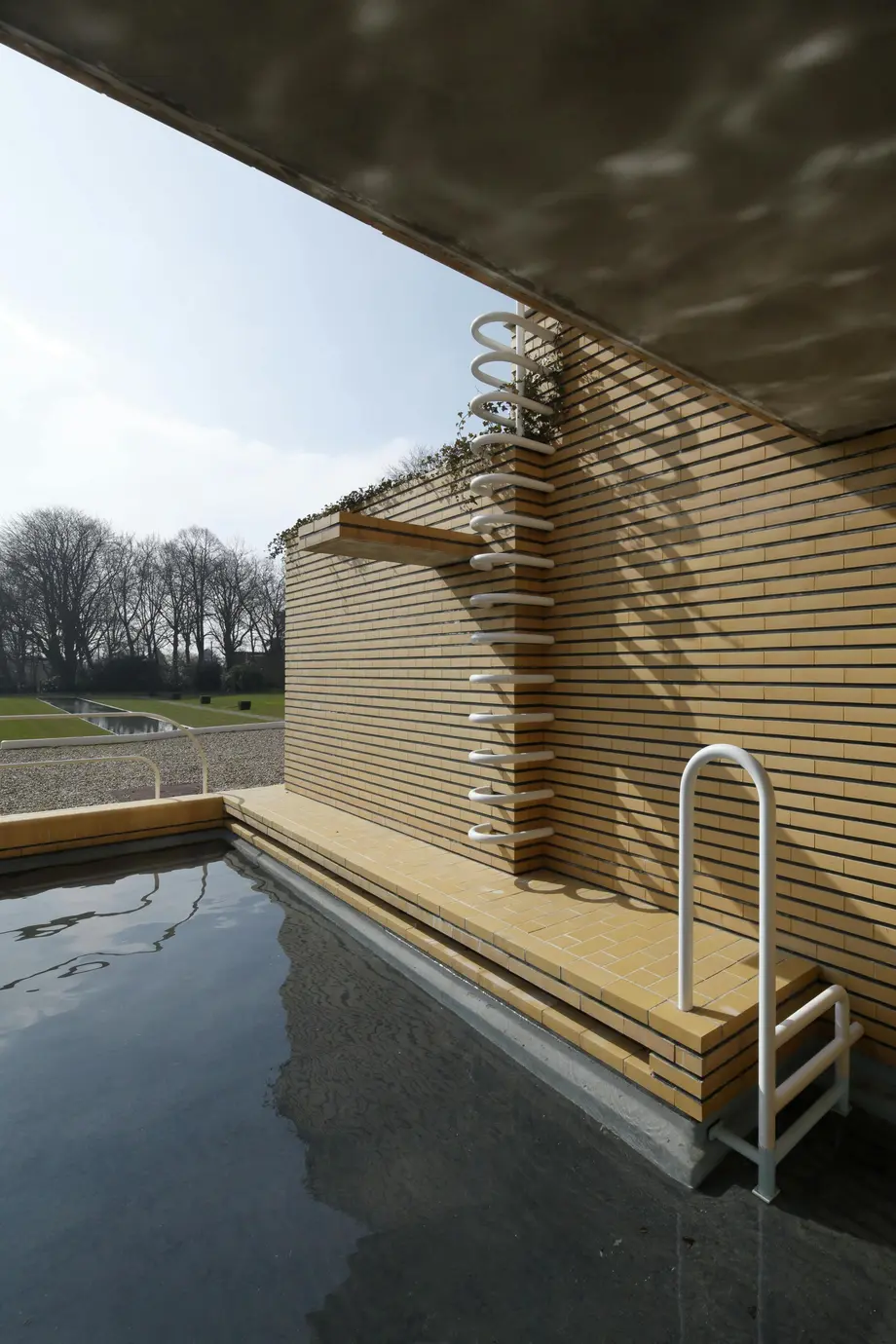 Un grand bâtiment moderne en briques au design symétrique se reflète dans une piscine rectangulaire située dans un jardin bien entretenu. Des arbres se trouvent à l'arrière-plan.