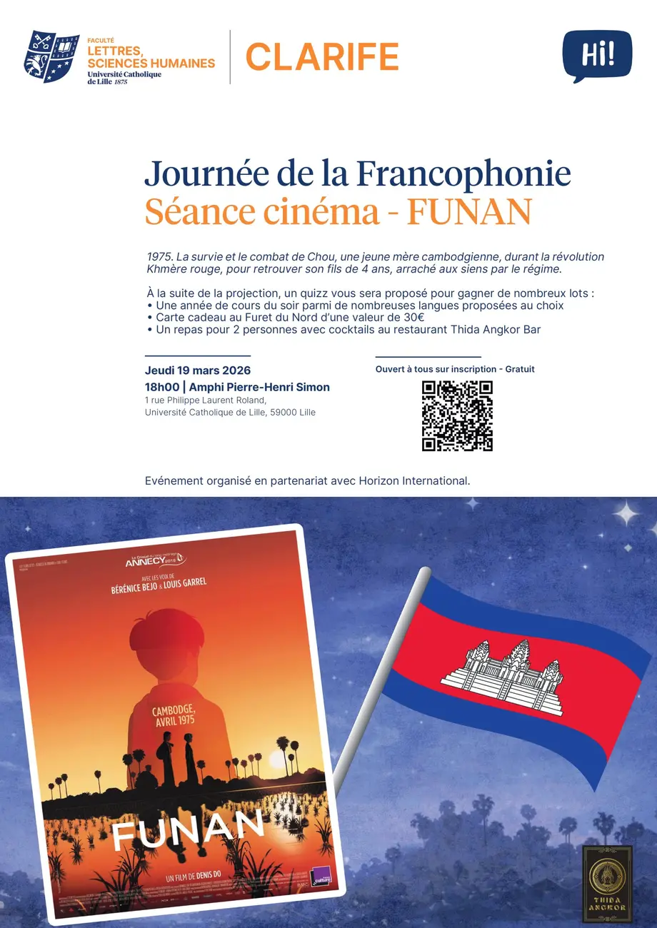 Le CLARIFE, centre de langues et d'interculturalité, de la Faculté des Lettres et des Sciences Humaines de l'Université Catholique de Lille, vous invite dans le cadre de la journée de la francophonie à la projection du film Funan.