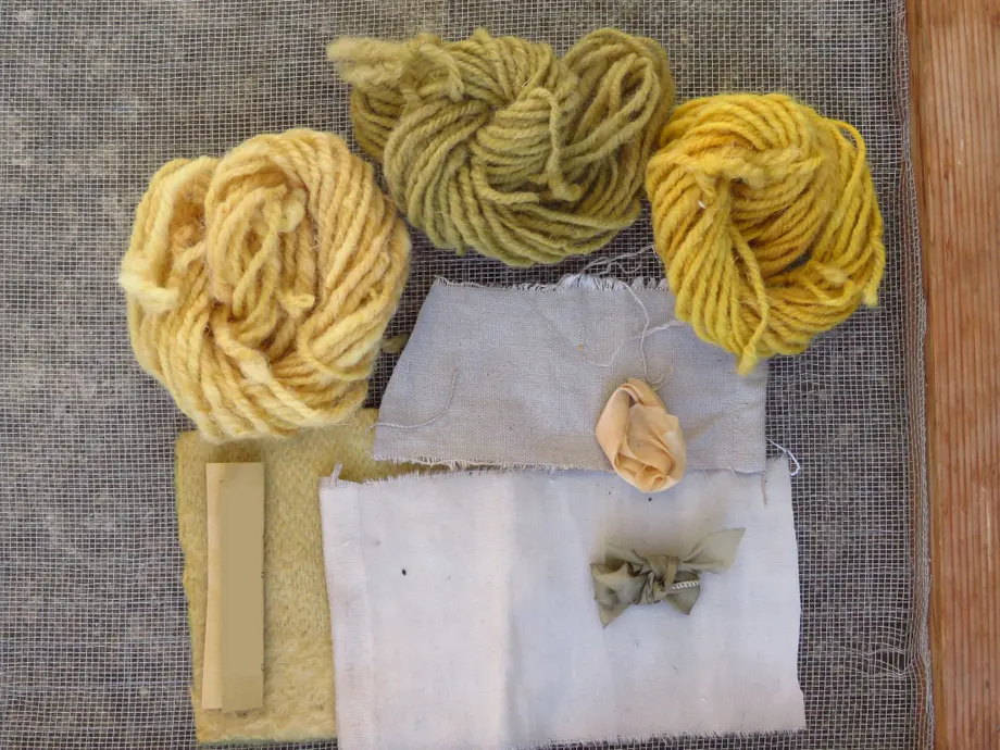 Teintures végétales sur laine et tissus (coton, lin) réalisées au four solaire.