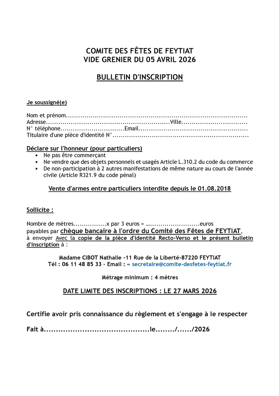 Vide-grenierLe 03/05/2026CouzeixLe Comité des Fêtes de la commune de Couzeix organise un grand vide-grenier de printemps.