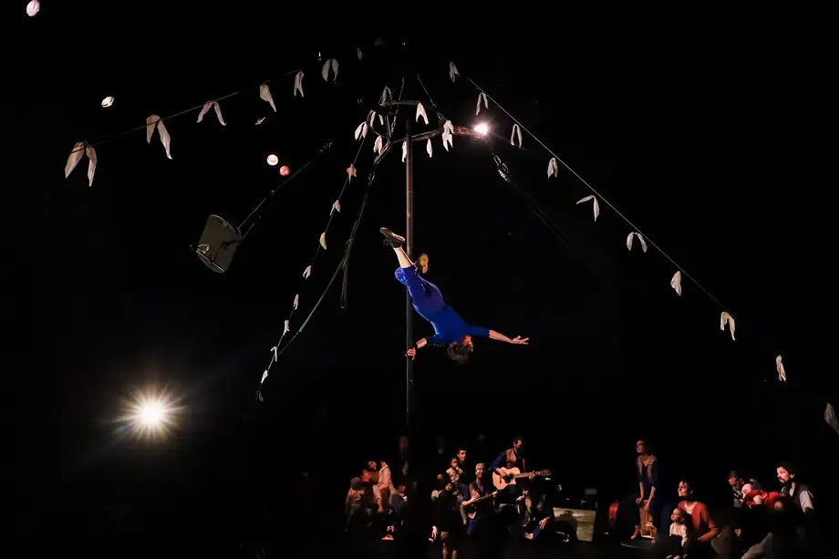 Dans une cohabitation joyeuse et musicale, les enfants sont libres de se déplacer, de glisser, de bouger avec les danseurs, de prendre des risques, d’être tout simplement. Sous le regard bienveillant et sécurisant des adultes qui les entourent, ils font partie du spectacle et accompagnent de leurs mouvements les musiciens haut perchés. Violon, flûte, guitare électrique et baglama mènent la danse du haut de ce manège aérien et embarquent dans un tourbillon enivrant et hypnotique. Comme le vent s’adresse à tous, que vous soyez en famille ou bien curieux de découvrir la poésie qui émane d’une rencontre entre artistes et tout-petits.