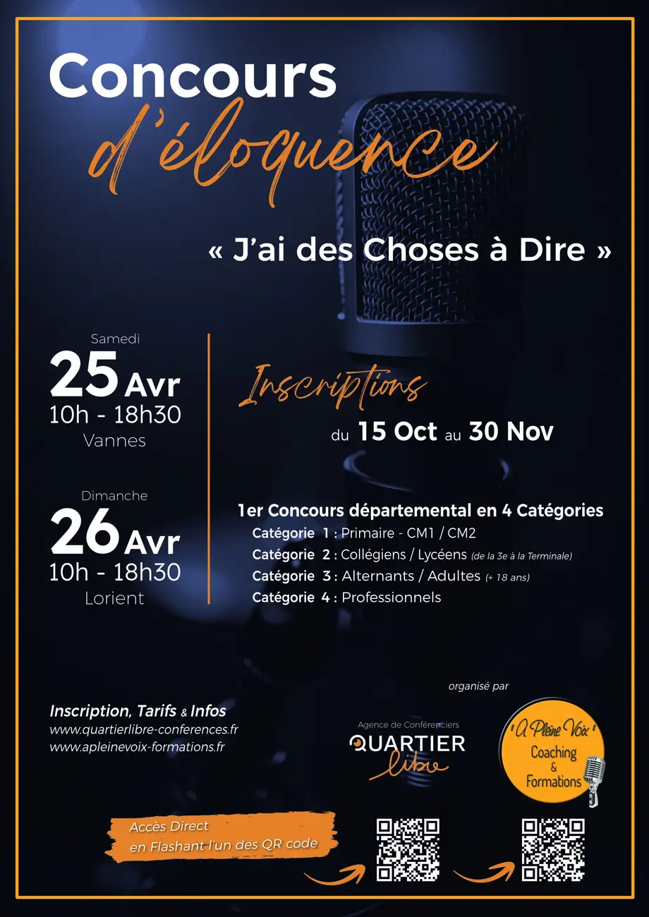 !! Que vous soyez élève, étudiant, amateur passionné ou professionnel aguerri, ce concours est l’occasion unique de partager vos idées, de progresser dans votre art oratoire et de vivre une expérience collective inoubliable. À vous de prendre la parole… et de faire vibrer le public !