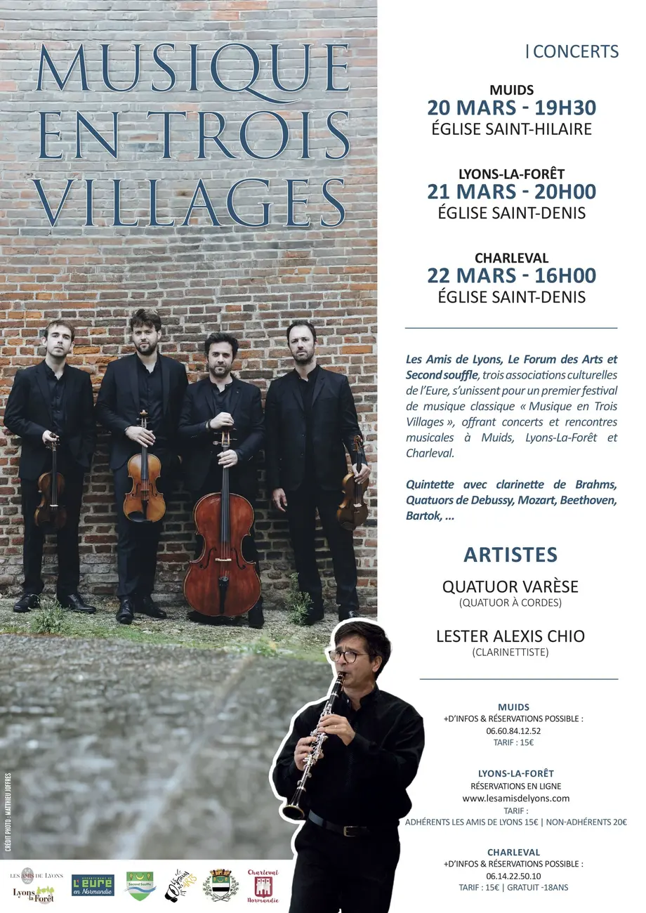 Trois associations culturelles de l'Eure associées pour créer un 1er festival de musique classique, Musique en Trois Villages, proposant dans chacune de leur commune des concerts mettant en avant des artistes et ensembles de renom.