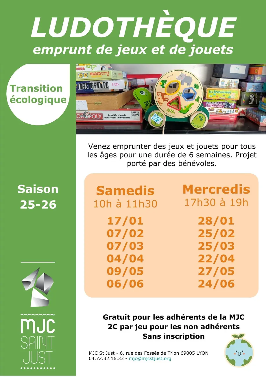 Bonne nouvelle ! La MJC ST JUST (5ème arrondissement de Lyon) lance une ludothèque gérée par des bénévoles, avec des jeux issus de dons, à destination des enfants mais aussi des adultes (jeux d’éveil, puzzles, jeux de cartes, jeux de stratégie, jeux de coopération, etc.)