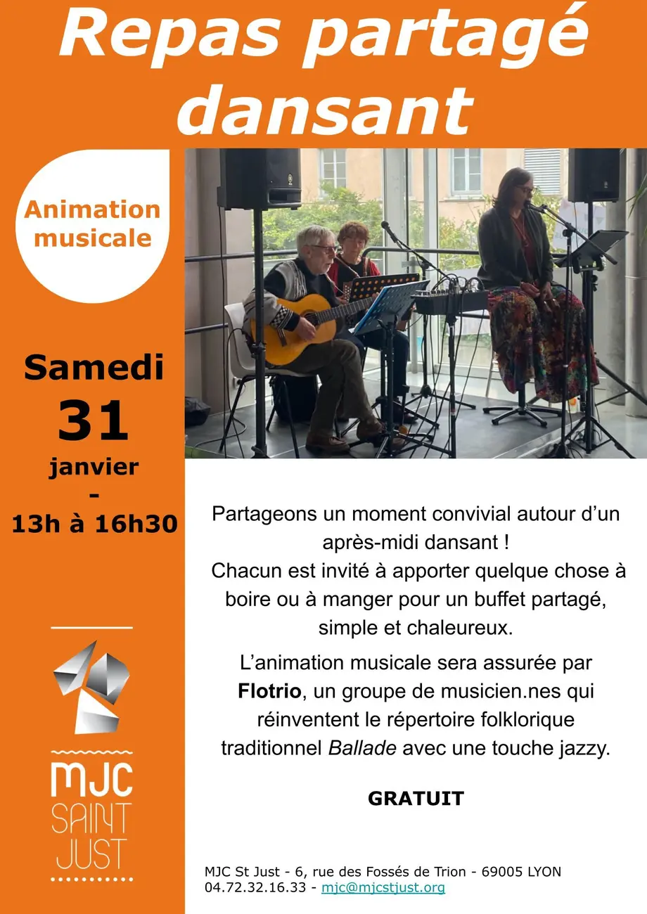 La MJC Saint-Just vous invite à vivre un moment convivial et festif à l’occasion d’un repas partagé dansant, le samedi 31 janvier de 13h à 16h30. Cet après-midi est placé sous le signe de la rencontre, du partage et de la bonne humeur, dans une ambiance simple et chaleureuse, ouverte à toutes et tous.