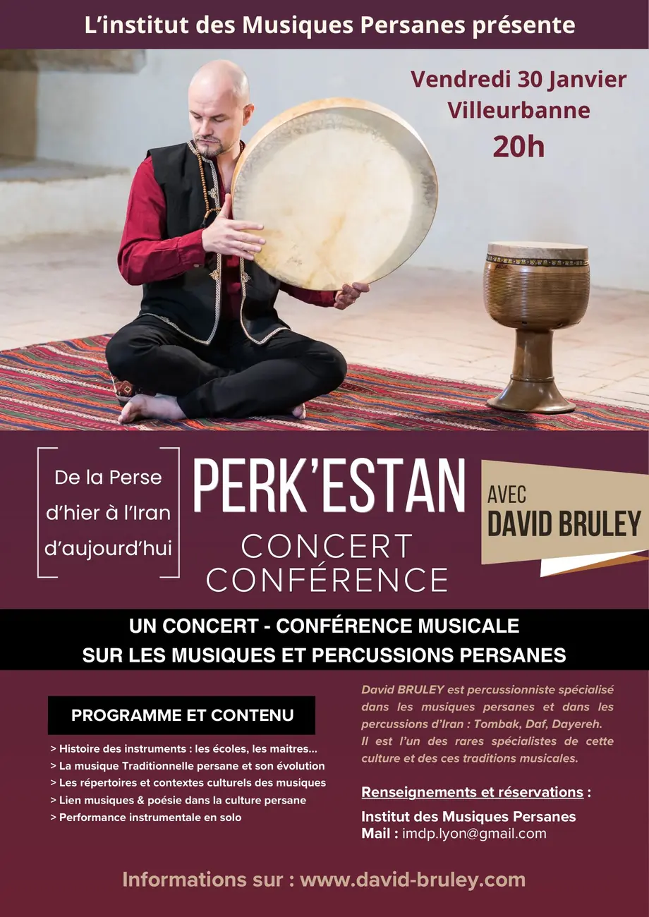 Le concept du « Perk’Estan » n’est pas habituel en France et passionne cependant largement le public. Le titre de ce spectacle regroupe deux idées principales : « Perk » qui est une abréviation de percussions, et « Estan » qui est un suffixe en persan qui veut dire « le monde de / qui vient de… ». Ainsi au travers de ce spectacle David a souhaité rendre hommage au monde des percussions et musiques d’Iran.