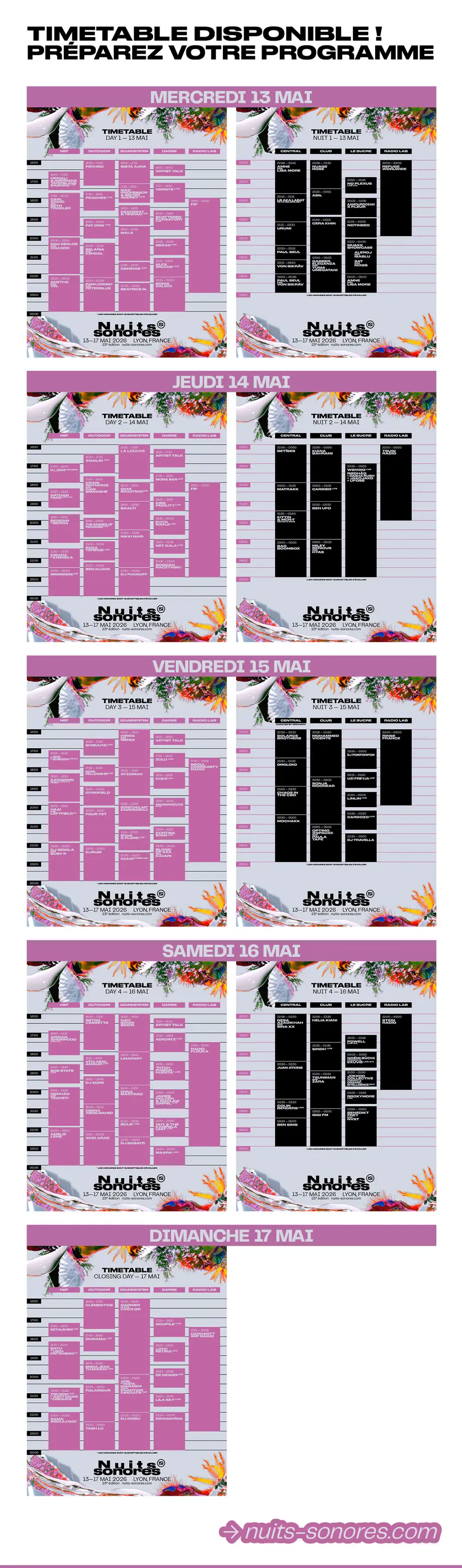 Parmi les nouveautés de cette édition, le Nuits sonores Record shop tour fait son entrée dans la programmation. Ce nouveau format s'inscrit dans la dynamique du festival d'ouvrir ses propositions au-delà des scènes principales, en allant à la rencontre des lieux et des acteurs de la culture musicale lyonnaise. La timetable complète de l'édition 2026 est désormais disponible, permettant à chacun de préparer son programme sur les cinq jours de festivités.