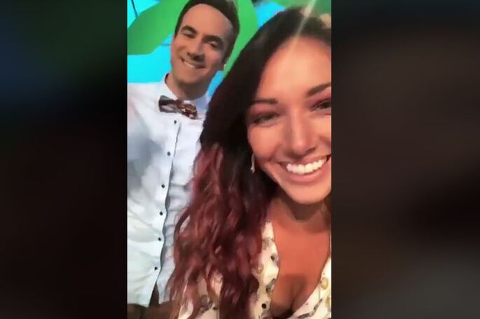 Delphine Wespiser sur le plateau de TPMP, avec l'animateur Alex Goude