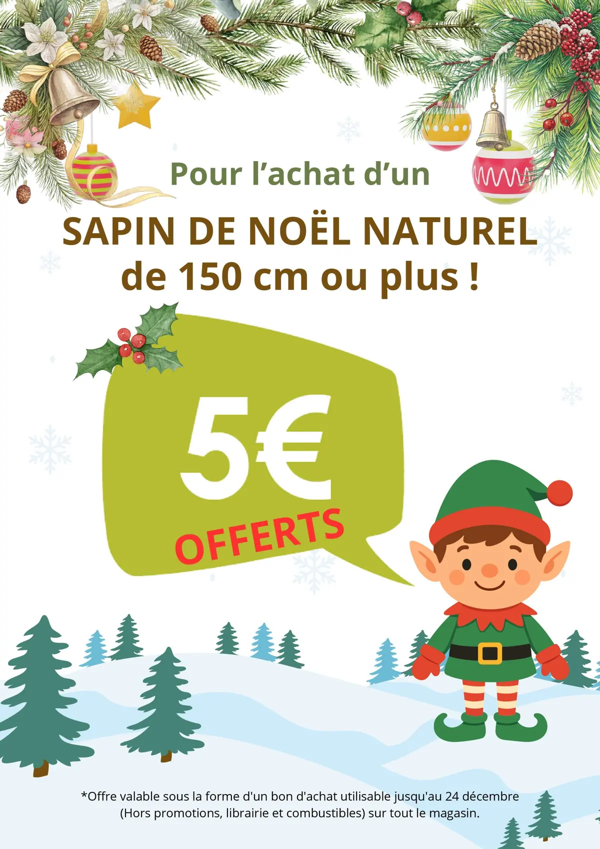 En ce moment, profitez d'une belle offre : pour l'achat d'un sapin de Noël naturel de 150 cm ou plus, repartez avec un bon d'achat de 5€ offert ! Le bon d'achat sera valable dans tout le magasin jusqu'au 24 décembre 2025, hors promotions, librairie et combustibles.