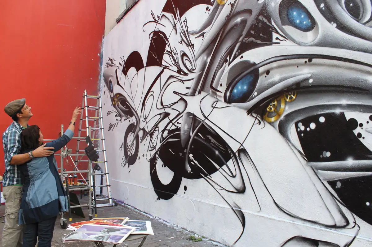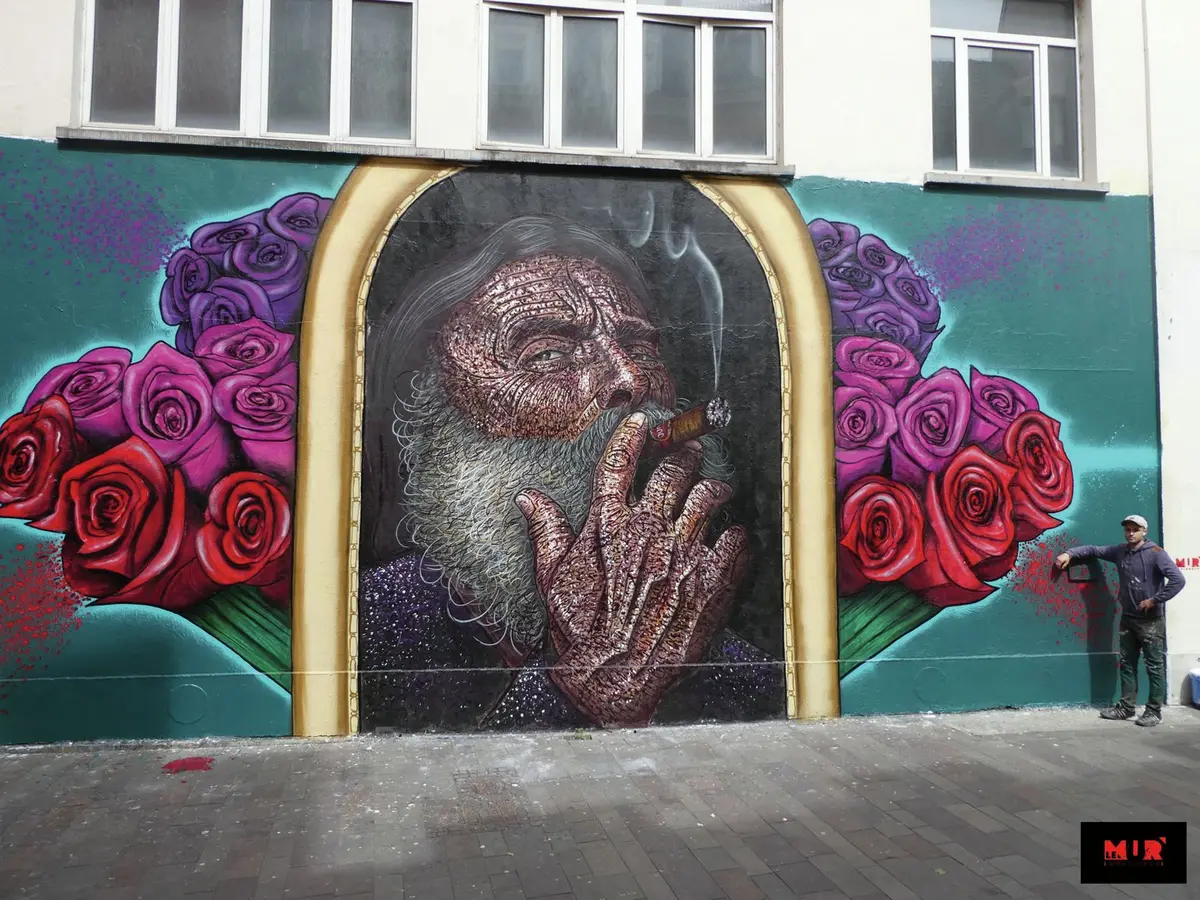 Encore un jour avant l'inauguration... Perché sur son échafaudage, Nelson, artiste originaire de Sélestat, peaufine le nouveau MUR de cet automne : "cette fois, on est sur un style très « graff' », chaque mur est bien spécifique, tous les courants du muralisme contemporain sont représentés", commente Linda Freymann, présidente de l'association Le MUR Mulhouse. "Depuis 2013, 95 murs ont été réalisés... Et je me souviens de chacun !".