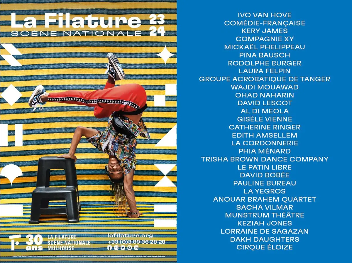À l’occasion des 30 ans de La Filature, et suite aux différentes crises que nous avons subies, il nous a semblé important de faire évoluer notre communication, en l’inscrivant dans une continuité formelle et esthétique (visuel très coloré, couverture de la brochure reliée par un fil), tout en la rendant plus figurative et donc plus accessible, et marquer ainsi une ouverture très nette vers de nouveaux publics et de nouvelles façons d’entrer dans La Filature. Pour ce premier visuel réalisé avec notre nouvelle graphiste Amélie Doistau, nous avons pris le parti de mettre en avant la pluralité des formes accueillies : le spectacle vivant – et en particulier la danse, le cirque, les formes urbaines, qui « cassent » l’image élitiste que le public peut avoir de La Filature – mais aussi les arts visuels, avec cette œuvre du photographe marocain Hassan Hajjaj, tirée de la série qu’il a réalisée autour du spectacle FIQ ! (Réveille-toi !) programmé en décembre 2023 – une partie de ces photographies sera exposée dans le hall de La Filature en amont du spectacle.