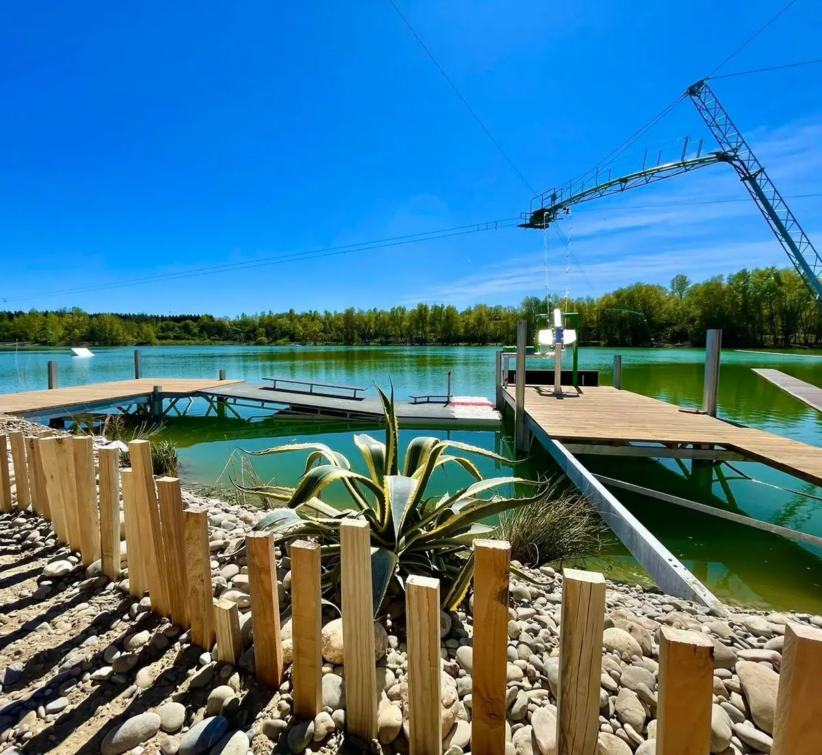 Vincent : C’était ce lac qui répondait vraiment à tous nos critères, il se trouve à proximité de l’autoroute, à proximité de l’aéroport, il avait vraiment cette superficie souhaitée, il est proche de la Suisse, proche de notre domicile. C’est comme ça que nous avons choisi ce lieu. De plus, le fait qu’une carrière soit située juste à côté, est également un choix. Cela représentait une réelle opportunité pour nous, puisque nous savions que ce plan d’eau allait être transformé en une base de loisir aquatique. Nous avons ainsi transformé un site industriel en un espace de loisir nautique et ça, c’est une première dans la région.