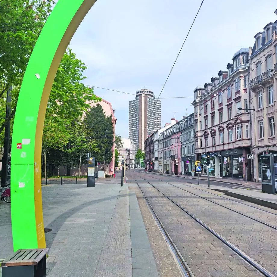 Départ rue des Bonnes Gens, explorez le quartier "Perret" et ses blocs qui jalonnent la porte de Bâle. Passez devant l'immeuble écran, construit par Perret et Girardet en 1953. Continuez rue Louis Pasteur pour arriver au pied de la Tour de l'Europe, imaginée par François Spoerry, qui culmine à 100 mètre de hauteur. Remontez ensuite la rue Kennedy, passez devant la mairie de Mulhouse, les bains municipaux et la maison During. Continuez toujours tout droit, puis tournez à gauche, rue Gay Lussac. Pédalez rue de la fonderie jusqu'à l'ancien site SACM devenu un ensemble de logements et de bureaux ainsi qu'un pôle d'industrie numérique : KMØ