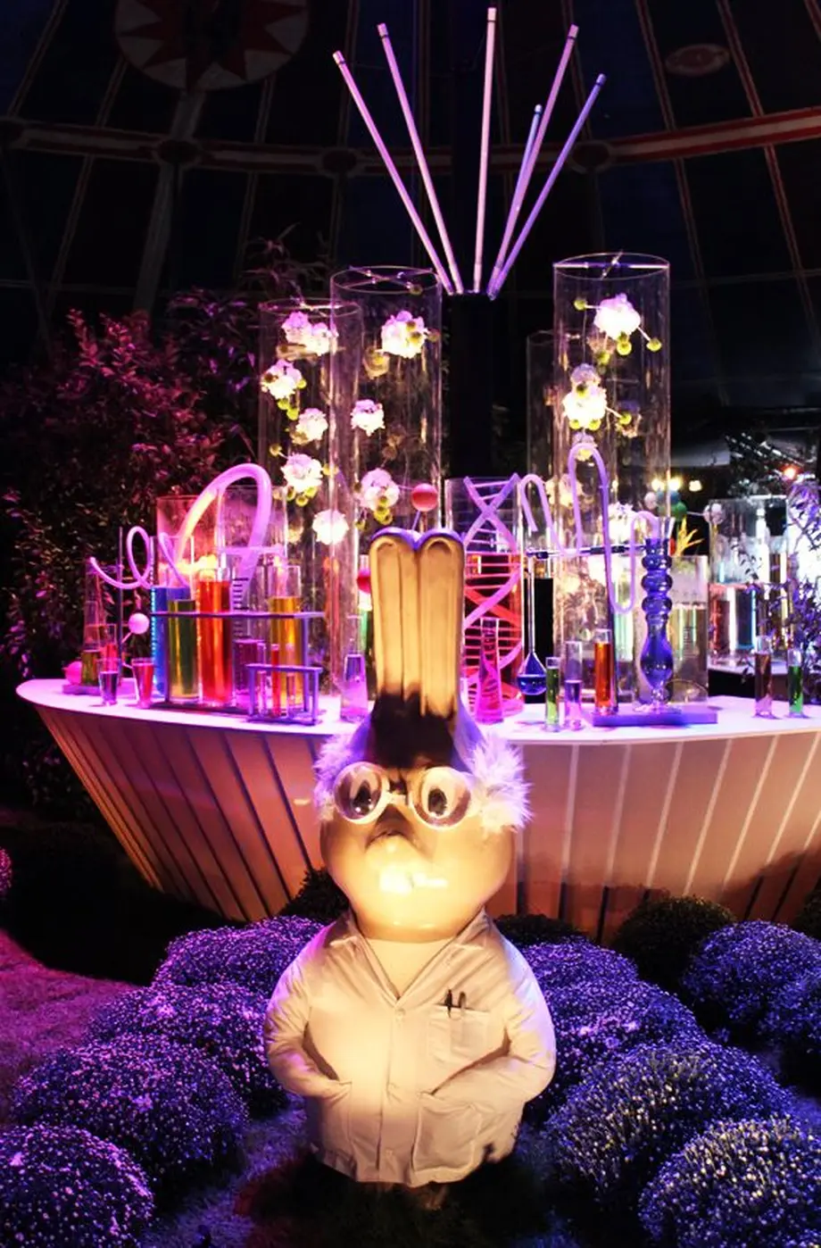 Sous le grand chapiteau-terrier des Lapi'Flore, mascottes 2016, nous avons croisé le Professeur Lapinou, devant ses tubes et pipettes. Que nous prépare-t-il, le bougre ?