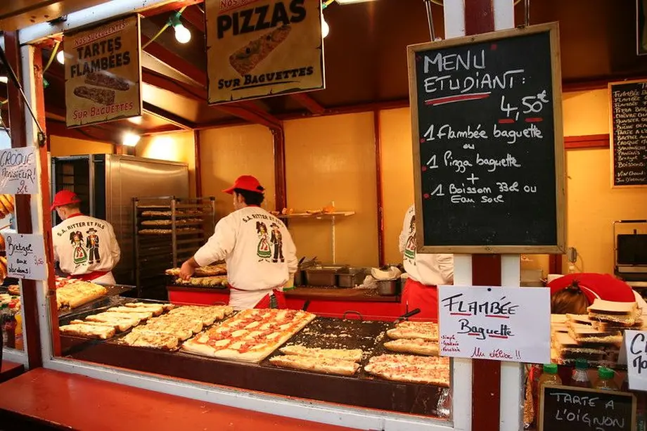 On l'adore notre tarte flambée locale ! Très enviée, jamais égalée, la flammekueche se décline aux marché de Noël alsaciens sous la forme pratique d'une baguette. La garniture reste inchangée, ce qui est légèrement différent c'est donc la pâte et la forme ! Bon, comme on dit chez nous "c'est un bon stück !" autrement dit, vous aurez assez mangé après ça !